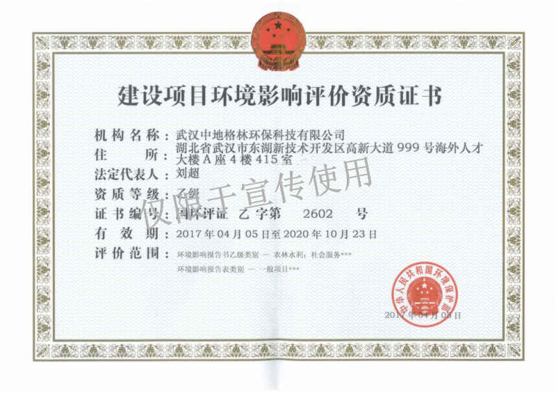 根據(jù)環(huán)保部《關(guān)于建設(shè)項(xiàng)目環(huán)境影響評(píng)價(jià)資質(zhì)審查結(jié)果(2017年第五批)的公告》,武漢中地格林環(huán)??萍加邢薰荆ê?jiǎn)稱“中地格林”)評(píng)價(jià)范圍調(diào)整獲審查通過。中地格林具有建設(shè)項(xiàng)目環(huán)境影響評(píng)價(jià)乙級(jí)資質(zhì),是由中國(guó)地質(zhì)大學(xué)(武漢)環(huán)境評(píng)價(jià)研究所的環(huán)境影響評(píng)價(jià)資質(zhì)改制而來(lái)。